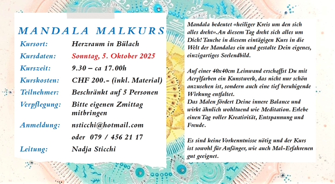 Mandala bedeutet «heiliger Kreis um den sich alles dreht». An diesem Tag dreht sich alles um Dich! Tauche in diesem eintägigen Kurs in die Welt der Mandalas ein und gestalte Dein eigenes, einzigartiges Seelendbild.